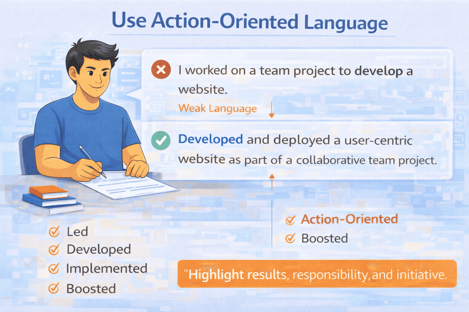 Instead of passive sentences, use action words that show initiative and responsibility.