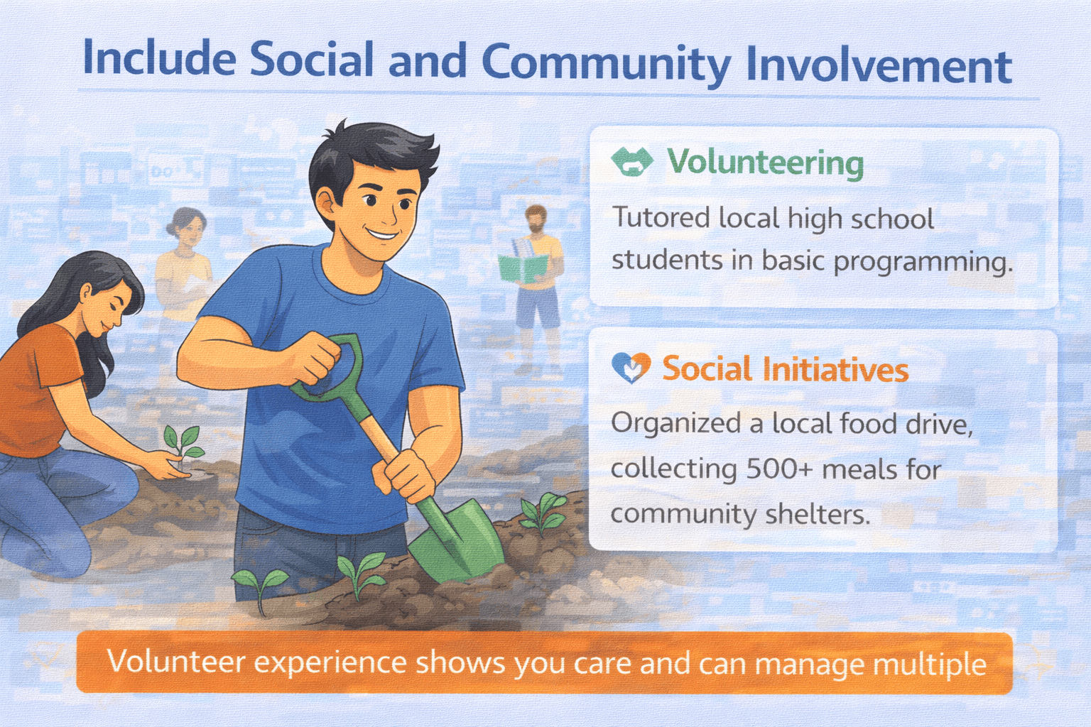 Volunteering, NGO work, blood donation camps, teaching initiatives, or college outreach programs are all worth mentioning if they reflect commitment and consistency.