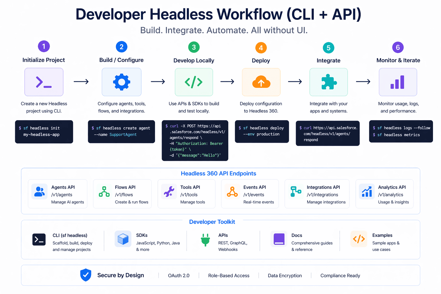 # Login without browser (JWT based) sf org login jwt \ --client-id CLIENT_ID \ --jwt-key-file server.key \ --username user@company.com # Generate AI Agent sf agent generate agent-spec \ --type customer-support \ --role "Handle billing queries" # Deploy Agent sf project deploy start