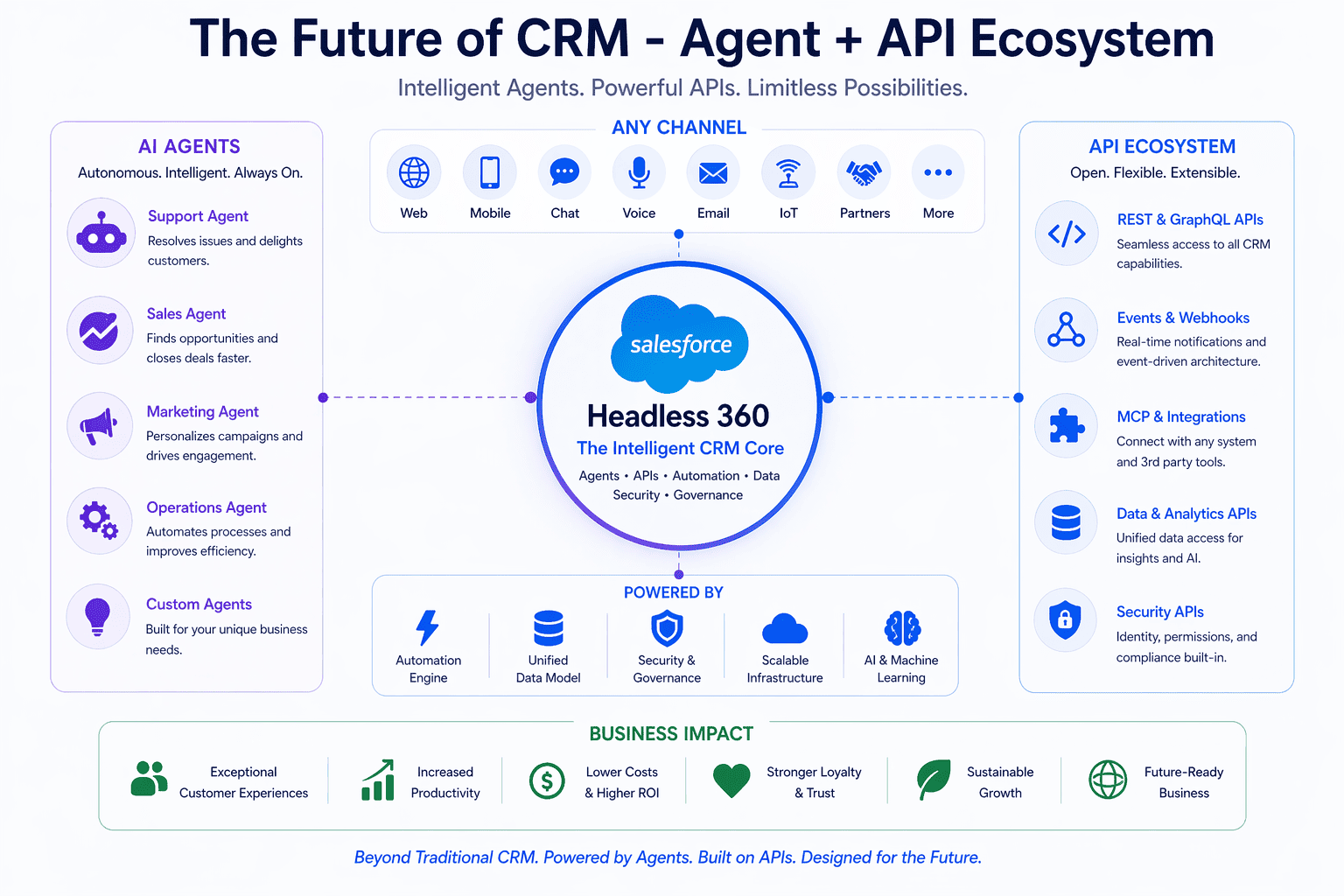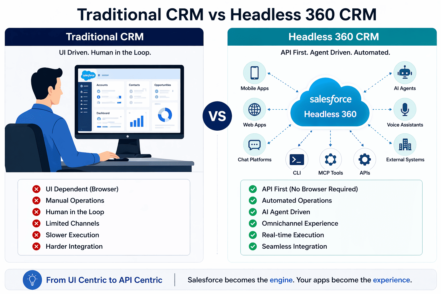 Headless 360 represents a shift from UI-driven CRM to API-driven CRM, where Salesforce operates as a backend engine powering intelligent workflows across multiple channels.