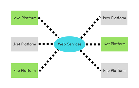 Consider the above figure, We can see that the application written in Java can interact with PHP and .net platforms through the web service. Therefore, it is completely platform independent. A web service exposed in the PHP can be consumed by any platform be it java, .net or PHP. This capability of the web service is making it so popular. Therefore, a web service is a language independent way of communication.